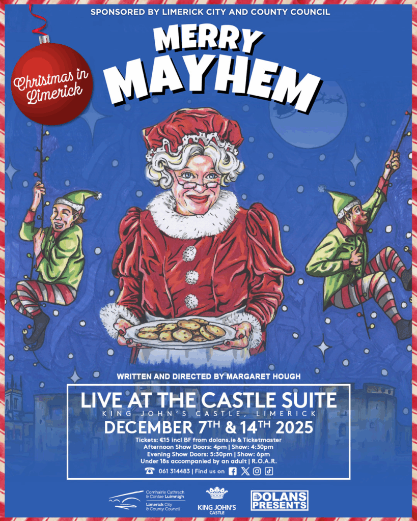 Open Door Productions, in partnership with Dolans Limerick and supported by Limerick City and County Council, invites families to join the festive search for Santa’s beloved Mrs. Claus in “Merry Mayhem”, a brand-new Christmas adventure at King John’s Castle this December.